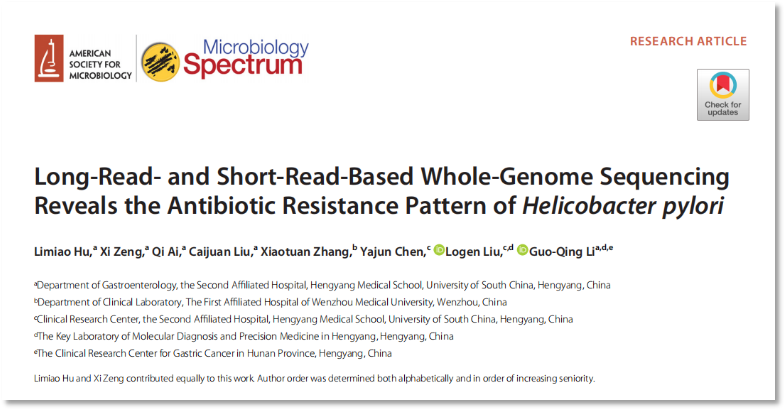 近日,南华大学附属第二医院李国庆教授团队在微生物领域核心期刊Microbiology Spectrum(中科院1区Top,IF: 9.04)上发表了题为“Long-Read- and Short-Read-Based Whole-Genome Sequencing Reveals the Antibiotic Resistance Pattern of Helicobacter pylori”的研究性论文(2023 Apr 17;e0452222.doi: 10.1128/spectrum.04522-22.
