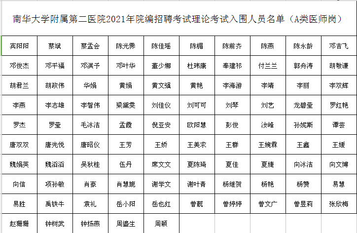 南华大学附属第二医院2021年院编招聘理论考试入围 人员名单公布(A类医师岗)