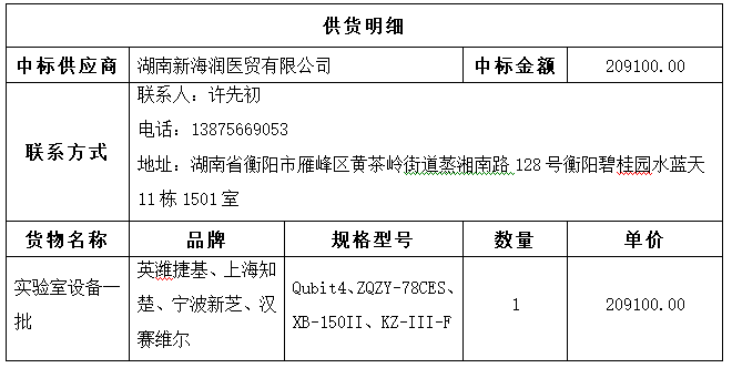 湖南振湘医药电子商务有限公司受南华大学附属第二医院的委托,对南华大学附属第二医院实验室设备一批采购项目进行公开招标,开标会议于2023年04月25日09:00(北京时间)在湖南振湘医药电子商务有限公司衡阳分公司举行,随后进行了评标,全过程由有关监督部门监督,评标委员会按招标文件的规定进行了评审,现将中标结果公示如下: