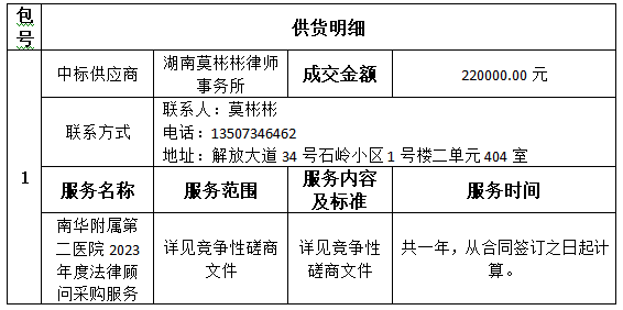 南华附属第二医院2023年度法律顾问采购服务于2023年07月05日结束,现将中标(成交)结果公告如下: