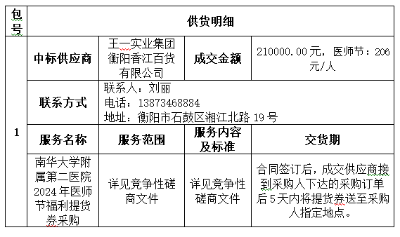 南华大学附属第二医院2024年医师节福利提货券采购于2024年08月26日结束,现将中标(成交)结果公告如下: