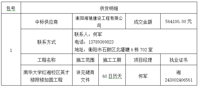 南华大学红湘校区英才楼附楼加固工程中标(成交)公告