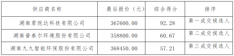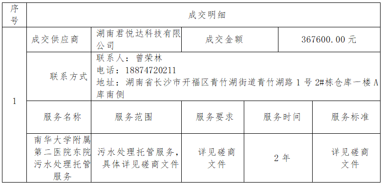 南华大学附属第二医院的东院污水处理托管服务项目于2024年10月22日结束,现将成交结果公告如下: