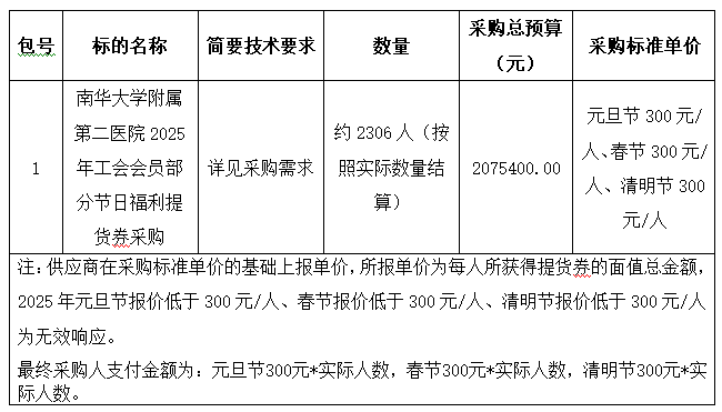 阶梯项目咨询有限公司受南华大学附属第二医院的委托,对南华大学附属第二医院2025年工会会员部分节日福利提货券采购进行竞争性磋商采购,现将采购事项公告如下: