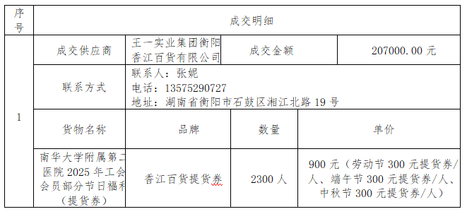 南华大学附属第二医院的2025年工会会员部分节日福利(提货券)采购项目于2025年4月18日结束,现将成交结果公告如下: