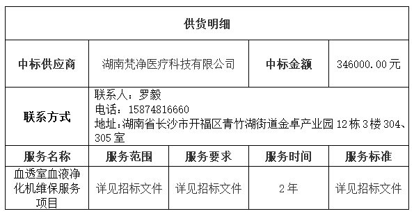 南华大学附属第二医院的南华大学附属第二医院血透室血液净化机维保服务项目(第二次)于2025年5月21日结束,现将中标结果公告如下: