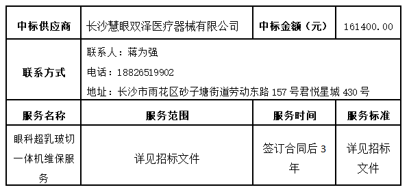 南华大学附属第二医院眼科超乳玻切一体机维保项目于2025年6月30日进行了开评标,现将中标结果公告如下: