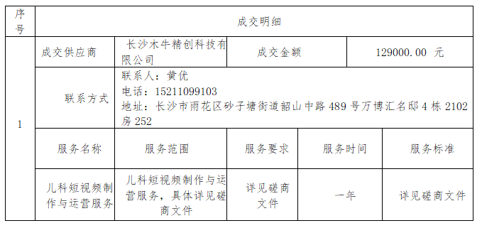 南华大学附属第二医院的儿科短视频制作与运营服务项目(第二次)于2025年9月26日结束,现将成交结果公告如下: