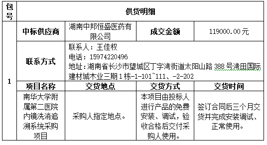 南华大学附属第二医院内镜洗消追溯系统采购项目于2025年10月17日结束,现将中标(成交)结果公告如下: