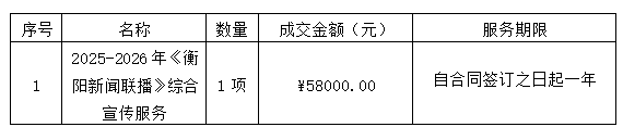 南华大学附属第二医院的2025-2026年《衡阳新闻联播》综合宣传服务项目于2025年12月2日结束,现将成交结果公告如下: