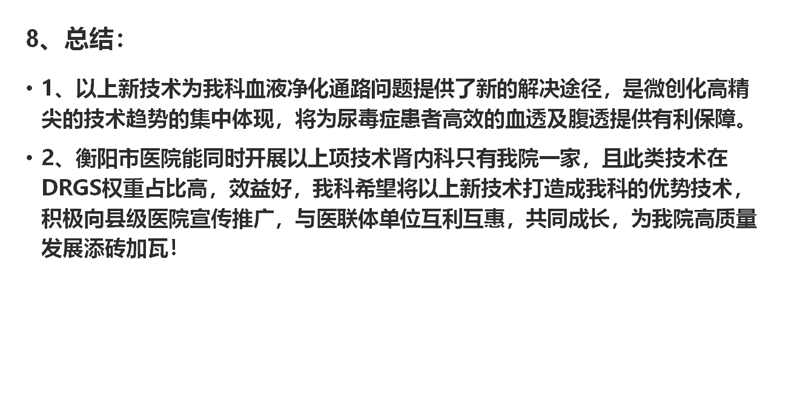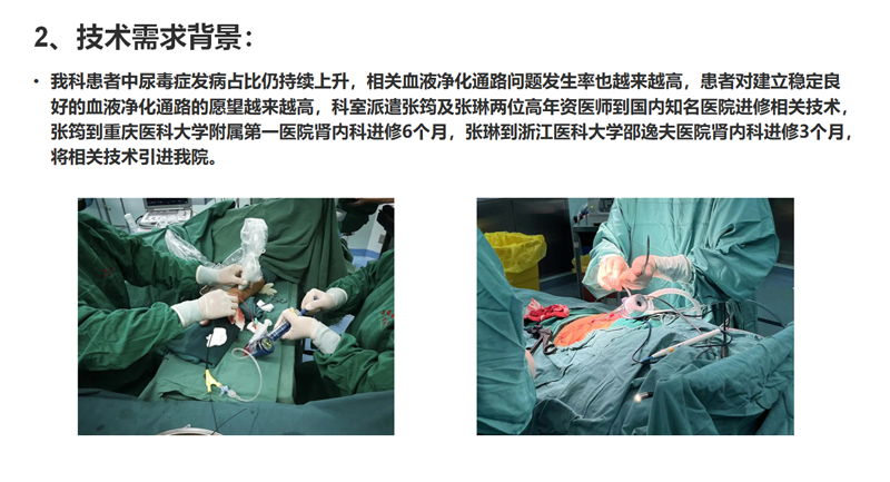 团队率先在湘南地区开展各种血液净化技术、中心静脉置管术、动静脉内瘘成形术、人工血管动静脉内瘘术、腹膜透析置管术及甲状旁腺切除术。目前科室拥有彩超机1台,能协助建立各种疑难血管通路及协助保障手术的安全及微创。目前开展的新型组合型人工肾技术包括血液透析滤过、血液透析灌流、血浆置换、免疫吸附、腹水回输等。