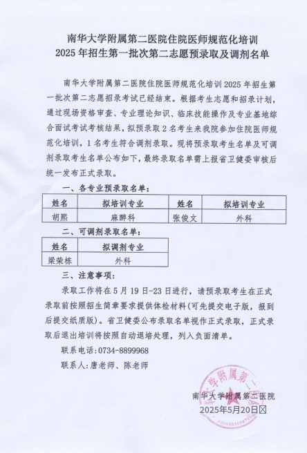 上一篇:南华大学附属第二医院住院医师规范化培训2025年招生第一批次第一志愿预录取及调剂名单 下一篇:南华大学附属第二医院住院医师规范化培训 2025年招生简章(第二批次)