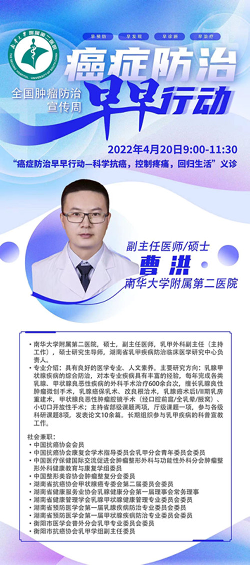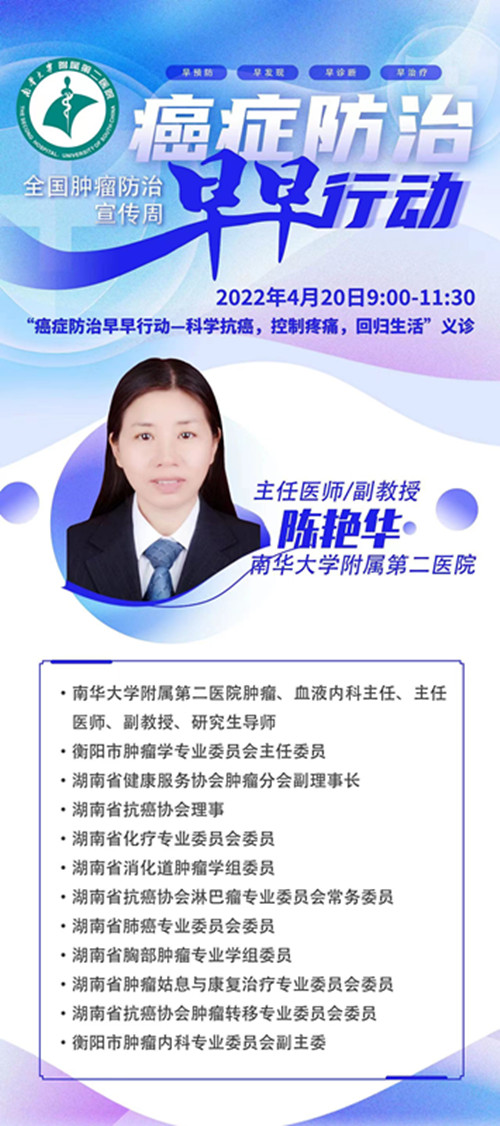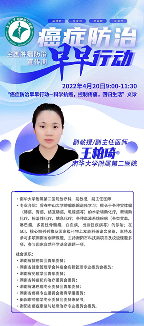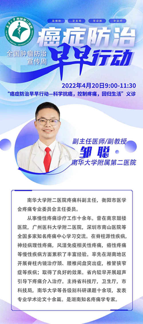 2022年4月15日— 4月21日是第28届全国癌症防治宣传周,为了推动衡阳抗癌事业和科普工作的健康发展,提高广大人民群众的防癌意识、增长科学防癌抗癌知识,南华大学附属第二医院积极响应健康中国科学抗癌的号召,拟在全国肿瘤防治宣传周召集肿瘤MDT专家团队(放疗科、肿瘤内科、乳甲外科)、疼痛康复专家团队通过义诊的形式举办“科学抗癌,控制疼痛,回归生活”活动。
