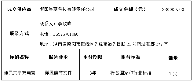 南华大学附属第二医院便民共享充电宝运营服务项目(第二次)于2024年1月23日结束,现将成交结果公告如下: