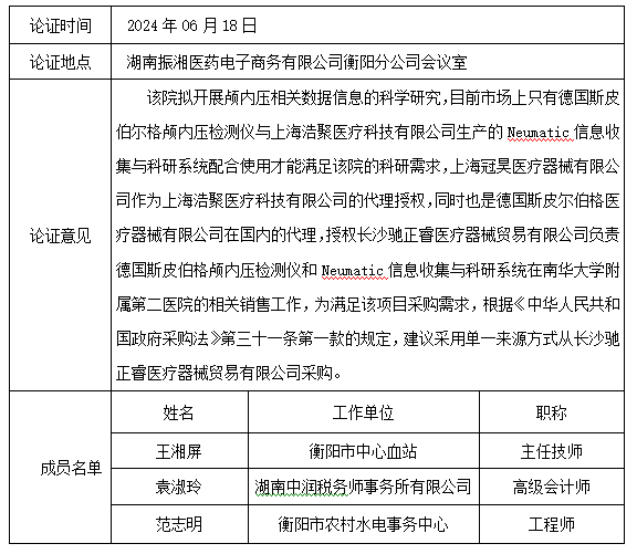 我院拟开展颅内压相关数据信息的科学研究,长沙驰正睿医疗器械贸易有限公司是此项项目中的独家代理商,符合单一来源采购规定,故申请采用单一来源采购方式实施。
