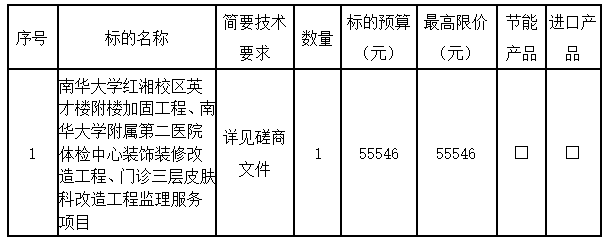 1、采购项目名称:南华大学红湘校区英才楼附楼加固工程、南华大学附属第二医院体检中心装饰装修改造工程、门诊三层皮肤科改造工程监理服务项目