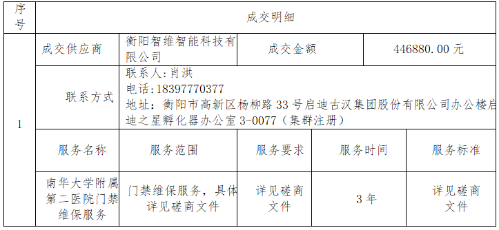 南华大学附属第二医院的门禁维保服务采购项目于2024年10月22日结束,现将成交结果公告如下: