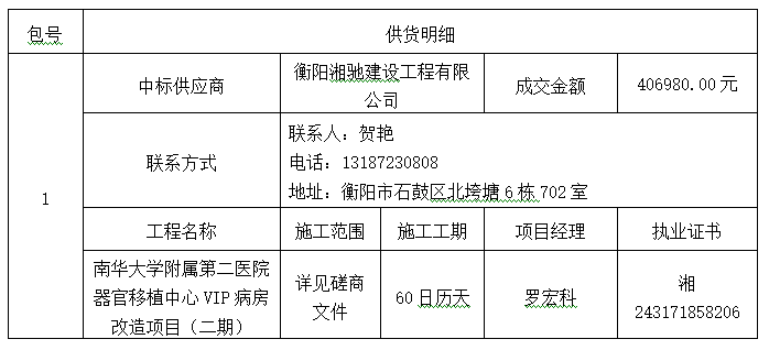 南华大学附属第二医院器官移植中心VIP病房改造项目(二期)中标(成交)公告