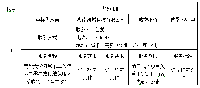 南华大学附属第二医院的南华大学附属第二医院弱电零星维修维保服务采购项目(第二次)竞争性磋商采购项目于2025年6月30日结束,现将中标(成交)结果公告如下: