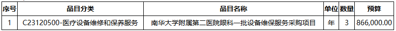 一、采购项目名称:南华大学附属第二医院眼科一批设备维保服务采购。 预算金额:¥ 866,000.00