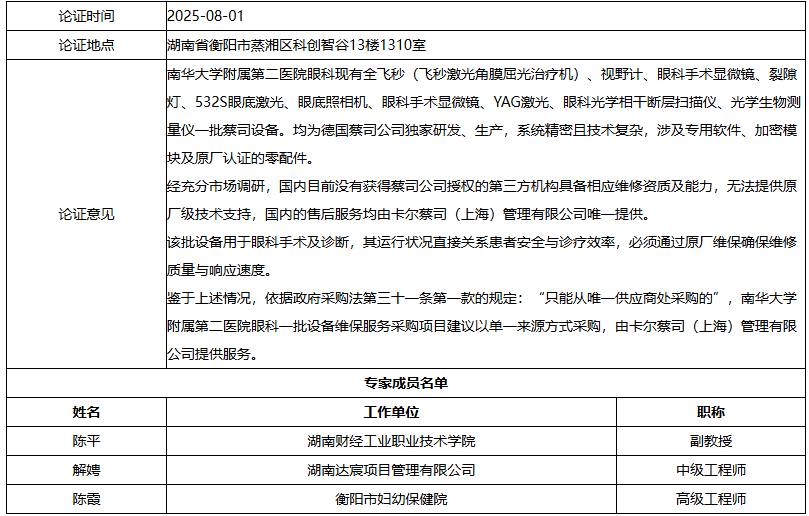 南华大学附属第二医院眼科一批设备维保服务采购单一来源采购公示