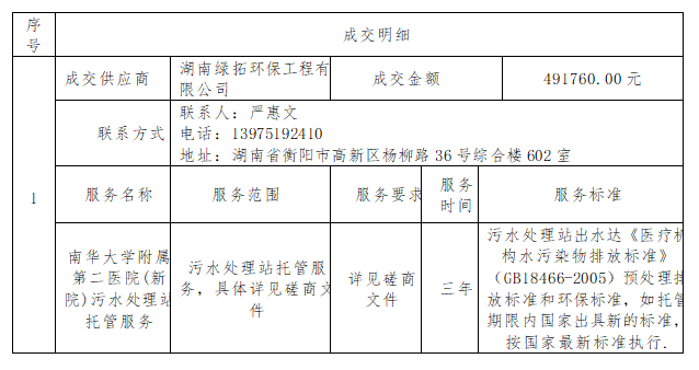南华大学附属第二医院(新院)污水处理站托管服务项目竞争性磋商成交结果公告