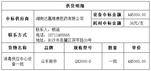 南华大学附属第二医院消毒供应中心设备一批采购项目中标公告