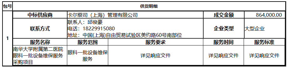 南华大学附属第二医院的南华大学附属第二医院眼科一批设备维保服务采购项目单一来源采购项目于2025年09月03日结束,现将中标(成交)结果公告如下: