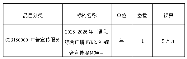 南华大学附属第二医院的2025-2026年《衡阳综合广播FM98.9》综合宣传服务项目拟进行单一来源采购,现将有关事项公告如下: