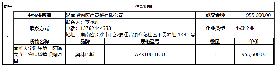 南华大学附属第二医院的南华大学附属第二医院荧光生物显微镜采购项目公开招标采购项目于2025年11月28日结束,现将中标(成交)结果公告如下: