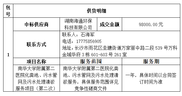 南华大学附属第二医院化粪池、污水管网及污水处理清淤服务项目(第二次)竞争性磋商中标(成交)公告